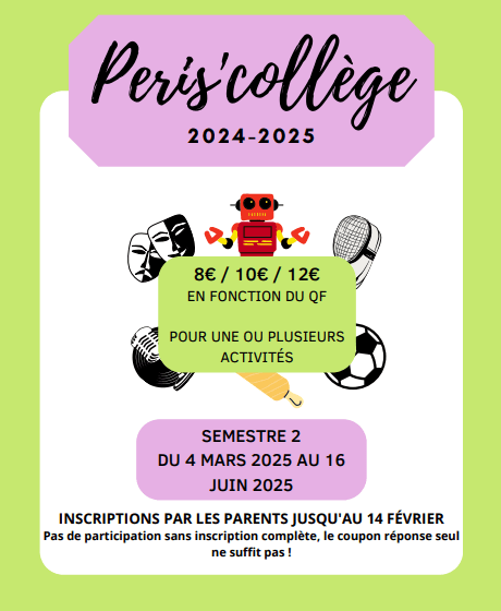 Nous nous attachons à ce que le Péris’collège soit accessible au plus grand nombre. Il existe trois tarifs en fonction du quotient familial :